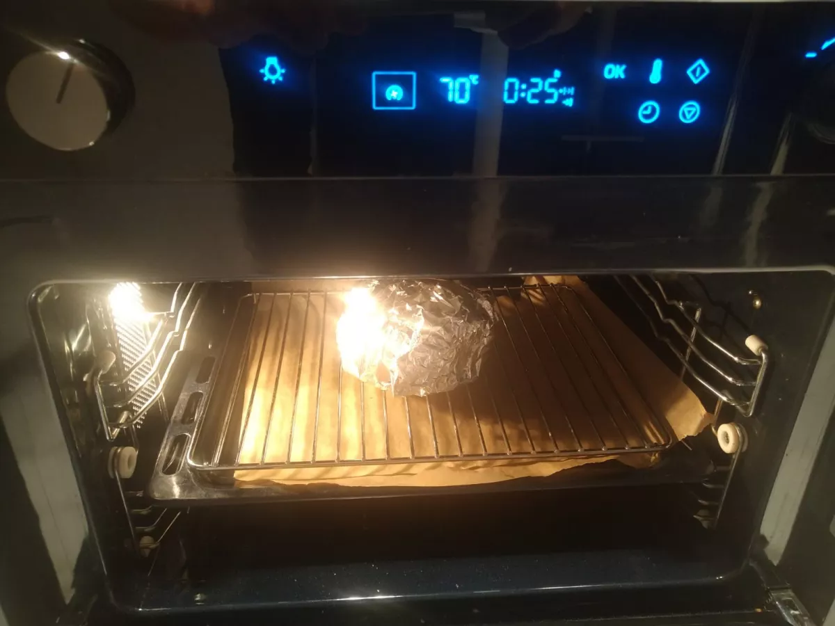 Wie passiert das? Zusammenfassend lässt sich sagen, dass der gesamte Burger im Ofen bei sehr niedriger Temperatur, eingewickelt in Aluminiumfolie, 70 ° C, etwa 25 Minuten lang erhitzt werden kann, um das Herz des Burgers mit einer kurzen Hitze von wenigen Minuten bei hoher Temperatur aufzuwärmen das Ende zu Ende geben es ein warmes Gefühl in Ihren Händen.